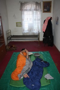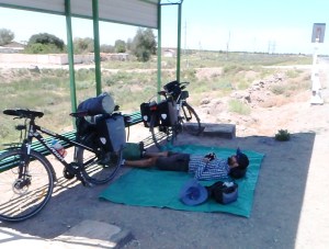 Uzbekistan was hot! Taking a post-lunch nap under a bus shelter.